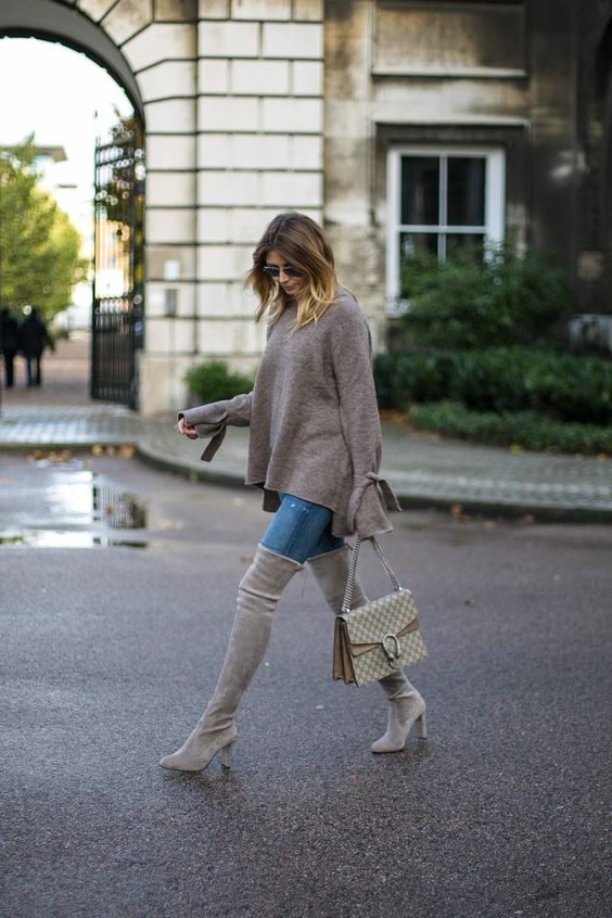 Помните, что эти модные осенние сапоги заявляют о вас как о смелой натуре, а потому в одежде следует придерживаться более скромного стиля. К примеру, с такой обувью хорошо смотрятся брюки-галифе, скинни, а также классические женские шорты, туники и трикотажные платья свободного кроя. При выборе колгот, избегайте ажурных моделей, сеточки. Отдайте предпочтение однотонной расцветке.