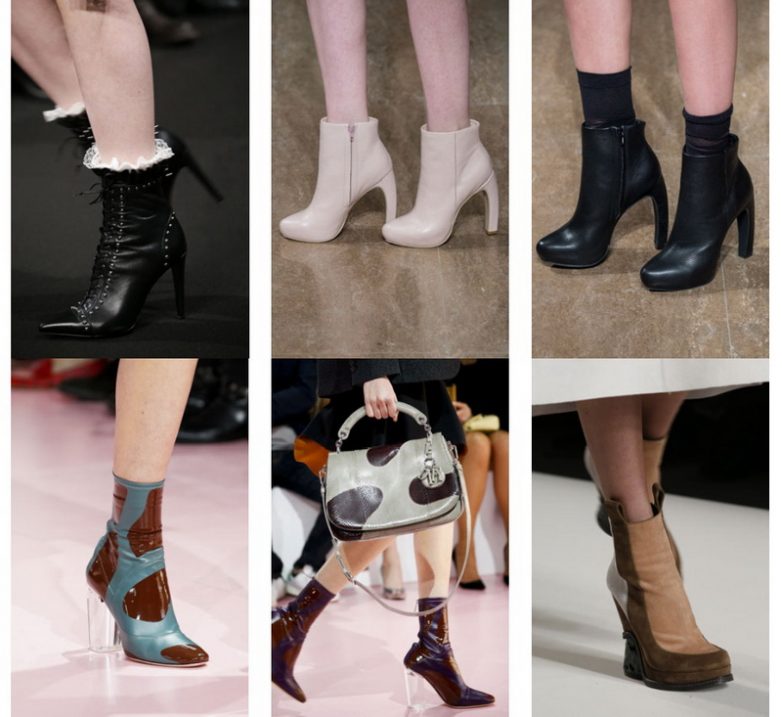 Модные ботильоны 2018 очень разнообразны: есть почти мужские и очень женственные модели, низкие, как туфли и высокие, как полусапожки. Каблуки преимущественно высокие, это может быть шпилька (для вечерних моделей), прямой и «толстый» устойчивый каблук или каблук сужающийся к низу, каблуки оригинальной формы и очень популярная танкетка.